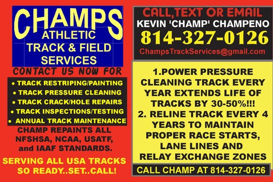 CHAMPS offers athletic track lining/logo painting, power pressure washing,latex & poly repairs for holes & cracks, inspections/testing for repairs or replacement, distant certification, and track french drain cleaning. Champs will repaint all NFSHSA, NCAA, USATF, AND IAAF STANDARD TRACKS. Member of AMERICAN SPORTS BUILDERS ASSOC., USA TRACK & FIELD ASSOC., NATIONAL FEDERATION OF STATE HIGH SCHOOLS ASSOC., AMATEUR ATHLETICS UNION, U.S. TRACK & FIELD CROSS COUNTRY COACHES ASSOC., SPORTSTURF MANAGERS ASSOC., & PENNA. STATE ATHLETIC DIRECTORS ASSOC., CERTIFIED AMERICAN DISABILITY ACT HANDICAP DISABLED INDIVIDUAL ATHLETIC TRACK CONTRACTOR AND AAPD AMERICAN ASSOCIATION OF PEOPLE WITH DISABILITIES.